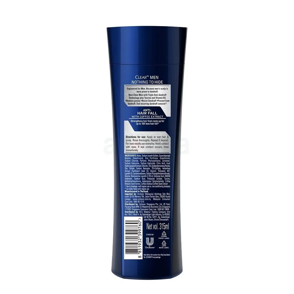 - Step into confidence with Clear Men Anti-Hair Fall Anti-Dandruff Shampoo, a tailored solution for the modern man facing the woes of hair fall, dandruff, and an itchy scalp. Our scientifically formulated shampoo is enriched with the potent benefits of Vitamin B3 and Taurine, ensuring not just a deep cleanse but a nourishing experience for your hair shafts.