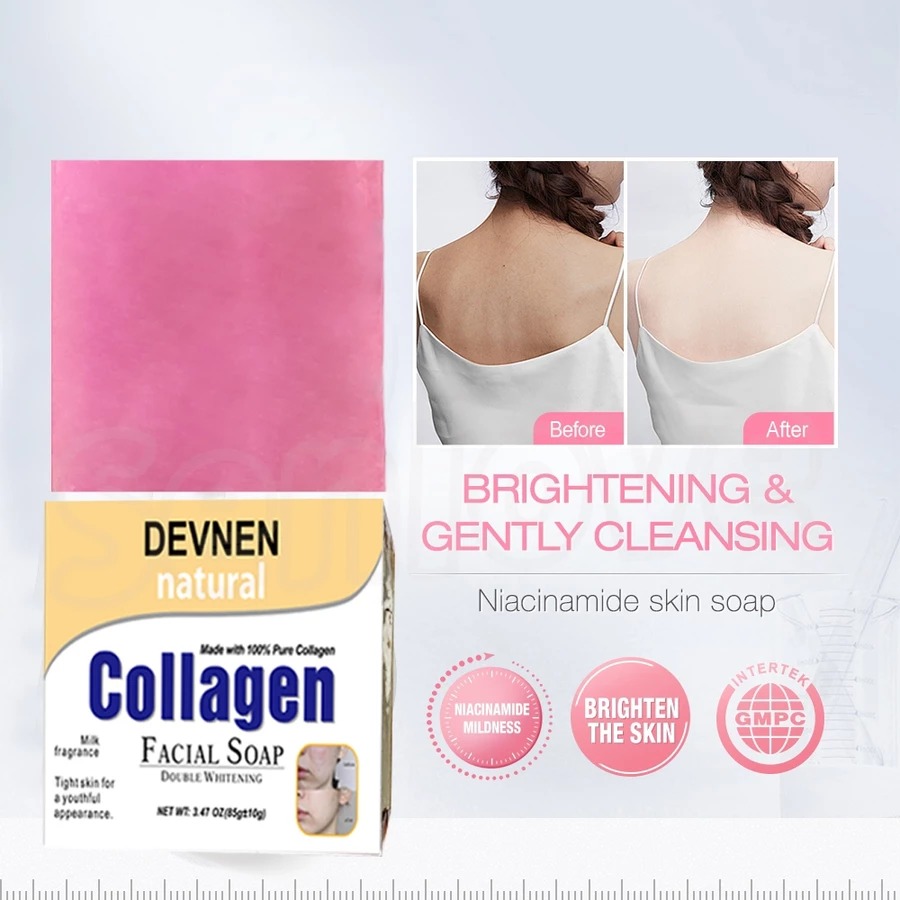 💐 Product Info: ▶ Specification: 85g ▶ Shelf life: 3 years ▶ Main Ingredients: collagen,Peptides,Amino acid,Vitamin E etc. ▶ Applicable skin type: All skin types Thanks to its ingredients this soap is perfect to reduce appearance of Acne Scars, Blemishes, Dark Spots. PROTECT YOUR SKIN: It works against pigmentation and keeps you skin even toned. It also contains Arbutin which helps in keeping your skin soft and supple. GAIN A RADIANT GLOW: instantly softening skin’s texture while improving firmness, radiance and glow. MOISTURIZE & NOURISH: our premium quality soap whitening, collagen Soap is not just a whitening product but is also an effective facial moisturizer, acne remover, acne scar remover, blackhead remover, and darkspot remover that penetrates deeply into the deepest layers of your skin to nourish and hydrate the cells giving you back that fresh, youthful glow! It is naturally antibacterial, anti-fungal and moisturizing.