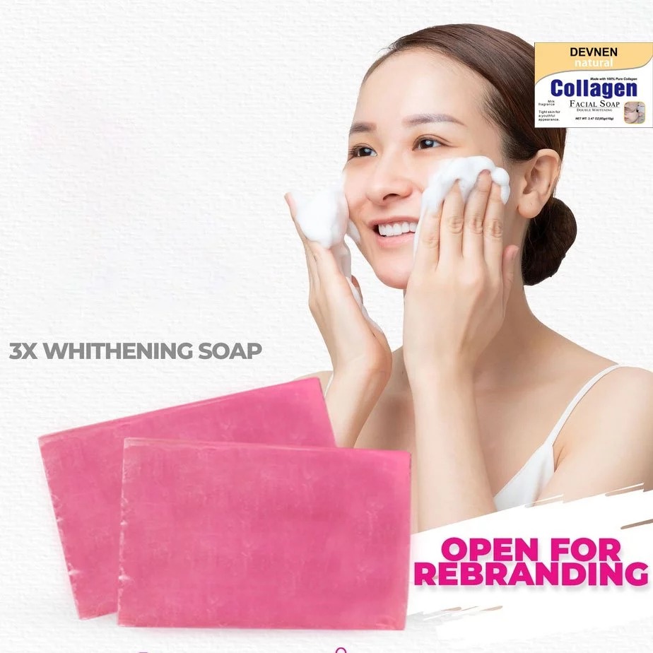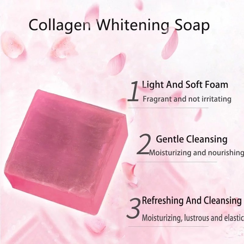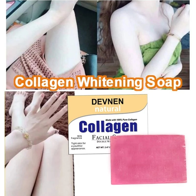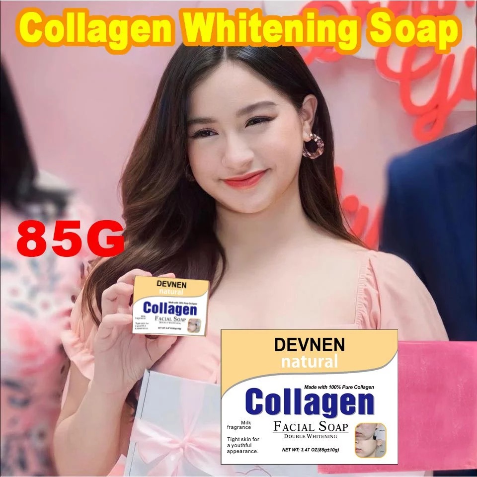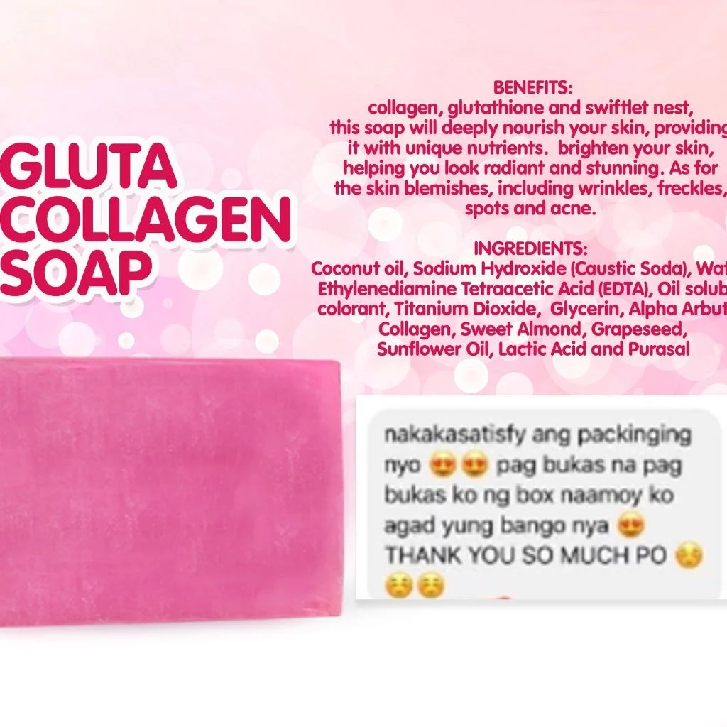 Product Info❣️: ▶ Specification: 85g ▶ Shelf life: 3 years ▶ Main Ingredients: collagen,Peptides,Amino acid,Vitamin E etc. ▶ Applicable skin type: All skin types Thanks to its ingredients this soap is perfect to reduce appearance of Acne Scars, Blemishes, Dark Spots. PROTECT YOUR SKIN: It works against pigmentation and keeps your skin even toned. It also contains Arbutin which helps in keeping your skin soft and supple. GAIN A RADIANT GLOW: instantly softening skin's texture while improving firmness, radiance and glow. MOISTURIZE & NOURISH: our premium quality soap whitening, collagen soap is not just a whitening product but is also an effective facial moisturizer, acne remover, acne scar remover, blackhead remover, and darkspot remover that penetrates deeply into the deepest layers of your skin to nourish and hydrate the cells giving you back that fresh, youthful glow! It is naturally antibacterial, anti-fungal and moisturizing. ❣️INSTRUCTION❣️ ; 🍓 Lather onto wet skin, gentle massage onto skin and leave it for 2 to 5 mins, rinse thoroughly Best result use day and night. 🍓 Need to expect Magbabalat ka pero di magiging dry ang skin mo. Malambot at makinis sa skin. 🍓 Amoy palang panalo na sa bango. 🍓 Safe for Pregnant and Lactating Mom.