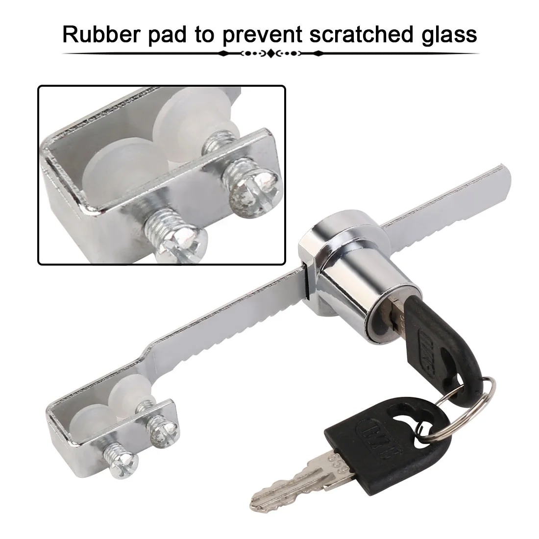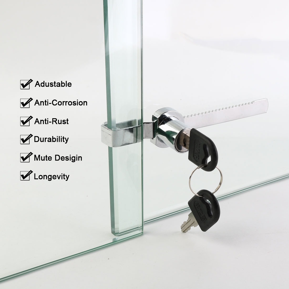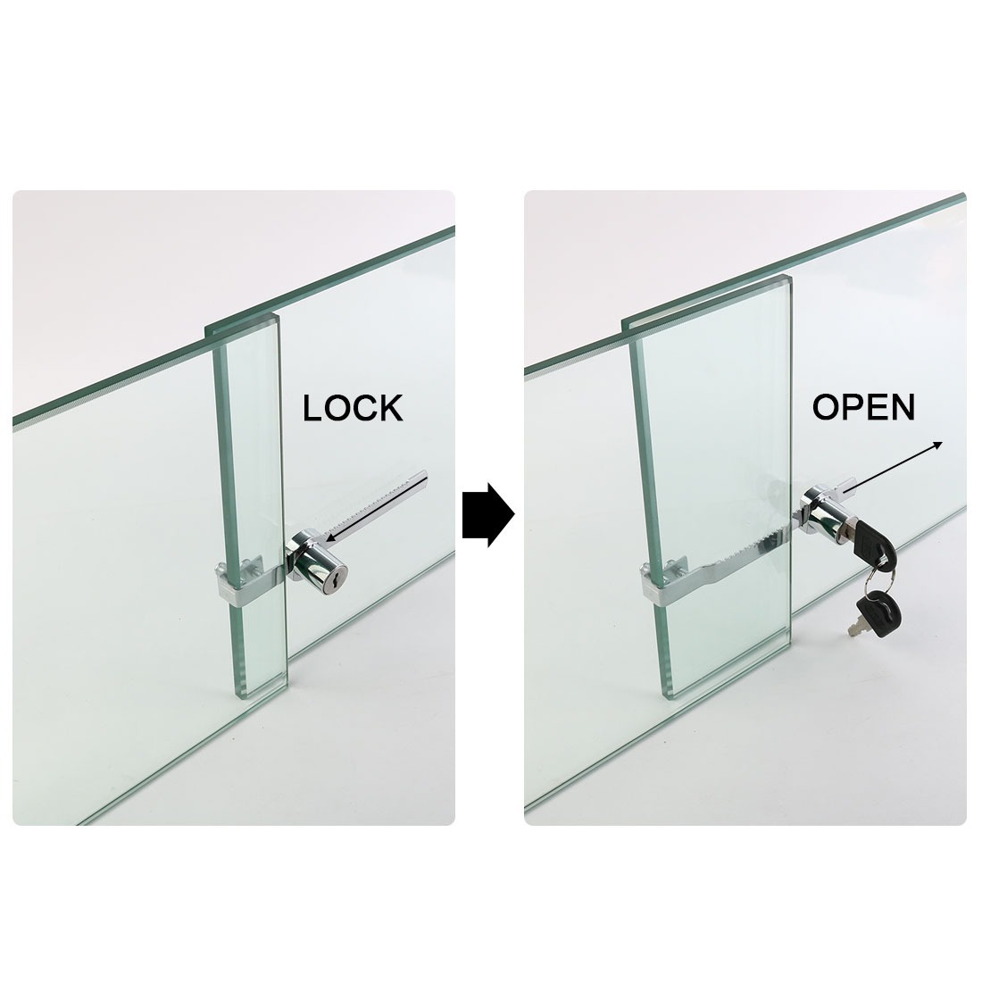 Made of stainless steel for windows and doors, cabinets, counter move switch, safe and convenient, with a pair of keys. Easily slips onto the edge of the glass for quick installation. Easy to install – slips on edge of glass door at any location.Available keyed alike so you can have multiple display cases all keyed the same. Feature: Perfect for single glass door display cases, trophy cases, and retail cases.Used to secure showcase and pass-thru cabinet panels etc.These locks are perfect for retail business and home applications.Suitable for display cabinets, vivariums, terrariums and any other sliding glass cabinet doors.