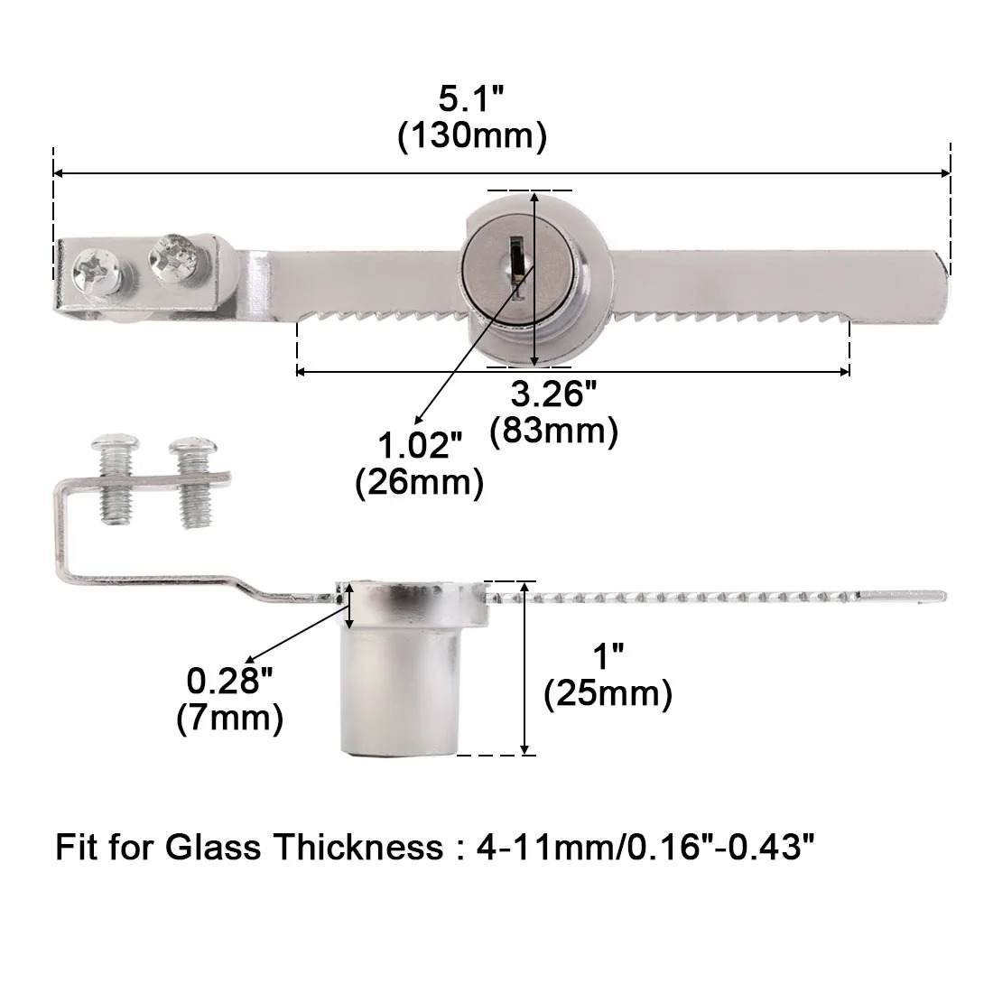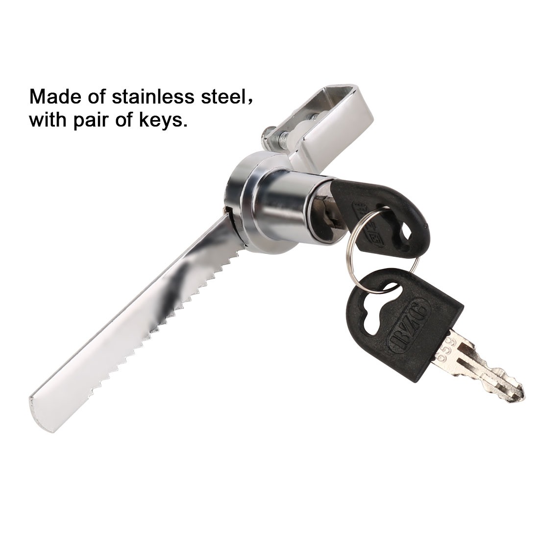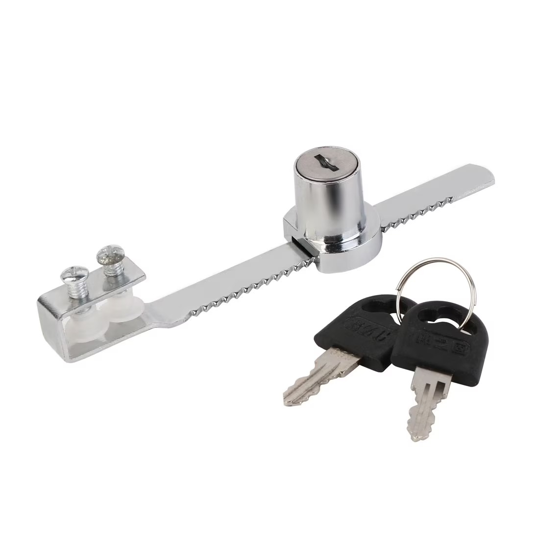 Made of stainless steel for windows and doors, cabinets, counter move switch, safe and convenient, with a pair of keys. Easily slips onto the edge of the glass for quick installation. Easy to install – slips on edge of glass door at any location.Available keyed alike so you can have multiple display cases all keyed the same. Feature: Perfect for single glass door display cases, trophy cases, and retail cases.Used to secure showcase and pass-thru cabinet panels etc.These locks are perfect for retail business and home applications.Suitable for display cabinets, vivariums, terrariums and any other sliding glass cabinet doors.