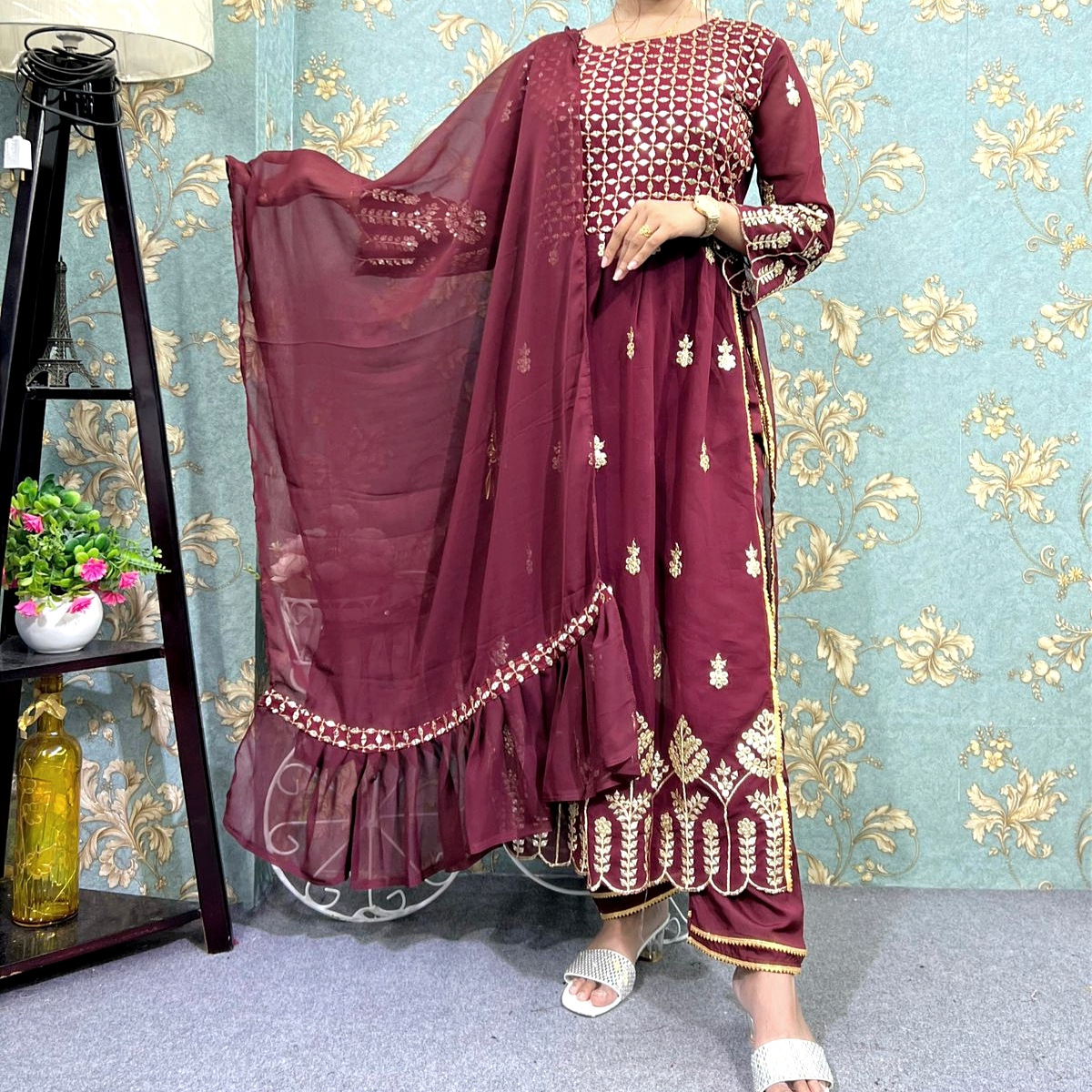 The Nayra Dress set for Women from Dream Ready is a stunning party wear ensemble crafted from a blend of silk and georgette, designed to elevate your party look. This elegant outfit exudes sophistication and charm, making it perfect for formal occasions and parties, ensuring that you stand out. The intricate detailing and exquisite craftsmanship make it a must-have for your wardrobe, adding a touch of elegance and style to your ensemble. Elevate your style with this exquisite dress set, perfect for making a statement at any event. The dress features a flattering silhouette with a flowing skirt and a fitted bodice, creating a timeless and elegant look. The delicate embellishments and fine fabric ensure a luxurious feel, while the versatile design allows for effortless styling for various occasions. Make a lasting impression with the Nayra Dress set, a true embodiment of grace and refinement, ideal for those who appreciate timeless elegance and impeccable quality.