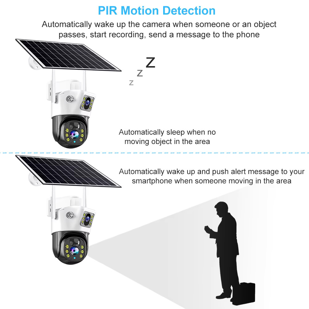- Solar Powered: Go green with solar-powered technology. The built-in solar panel keeps your camera charged, providing continuous operation without the need for frequent battery changes.