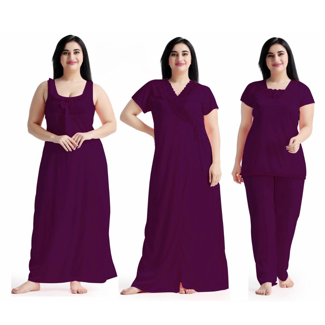 মহিলাদের জন্য 4 পার্ট নাইটি সাটিন সিল্ক ভারতীয় সেরা মানের আরামদায়ক সেক্সি ফ্যাশনেবল মার্জিত এবং পরিশ্রুত নাইট ড্রেস মহিলাদের জন্য মহিলাদের 4-পার্টের দীর্ঘ সলিড নাইট ড্রেস সেটের সাথে রাতের বিলাসিতা আলিঙ্গন করে