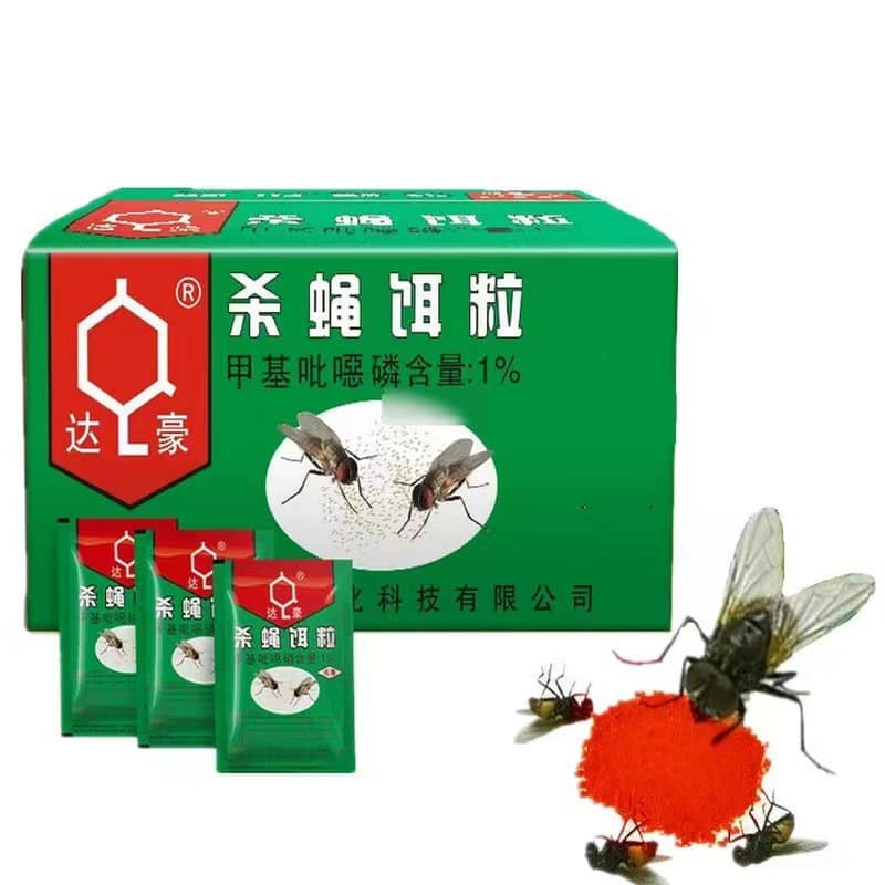 - This product specializes in flies, easy-to-use bait flies drugs, this drug is almost non-toxic, will not cause harm to animals, apply to families, restaurants, hotels, shops, food factories, farms and other places where there are flies nuisance.Flies die 30 seconds after touchingProduct characteristics: slightly toxic, Harmless to human bodyForm: powder25/50/100 packs/boxUsage: Put this granule into a small dishes or tray and put it on the fly gathering place (when the second medicine is put in the room, remove the previous invalid medicine).