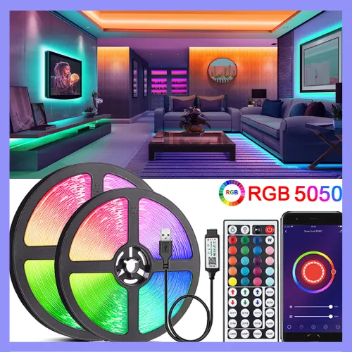 - Enhance the ambiance of any space with our LED Strip Lights RGB 5050 Bluetooth Tape. This versatile lighting solution is perfect for adding vibrant and colorful accents to your room, desk, screen, or TV background. The LED strip is flexible, allowing you to shape and install it effortlessly. With its Bluetooth connectivity, you can easily control the lights using your smartphone, offering convenience and customization at your fingertips.