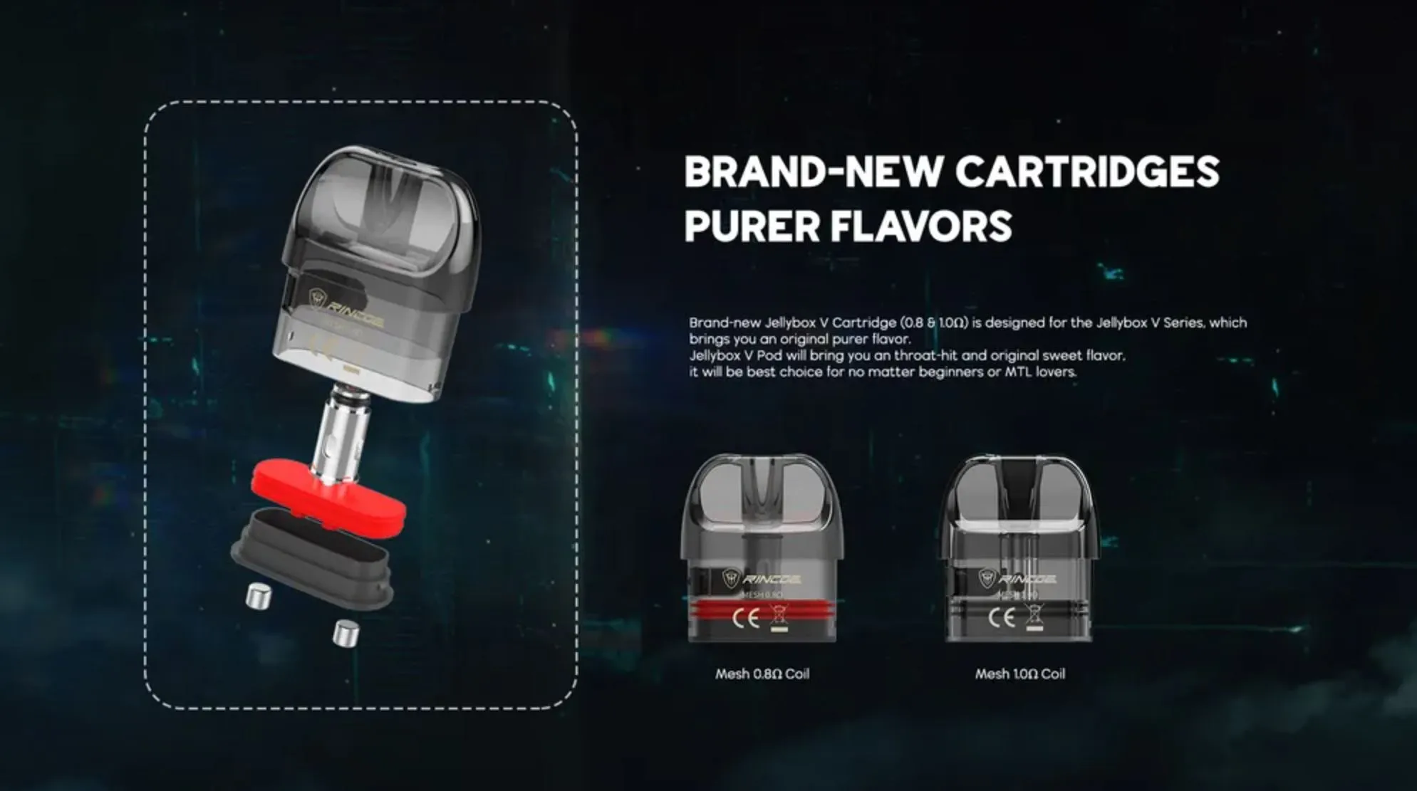 The JELLYBOX V POD CARTRIDGE is a replaceable cartridge designed for use with the JELLYBOX V kit. It is specifically designed for vaping e-liquids and features a refillable design for easy refilling. The cartridge also incorporates a coil system to provide optimal flavor and vapor production.