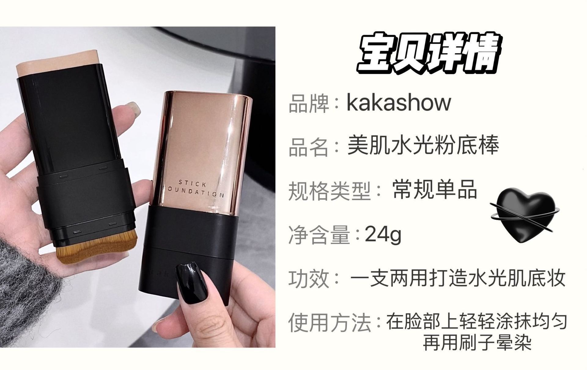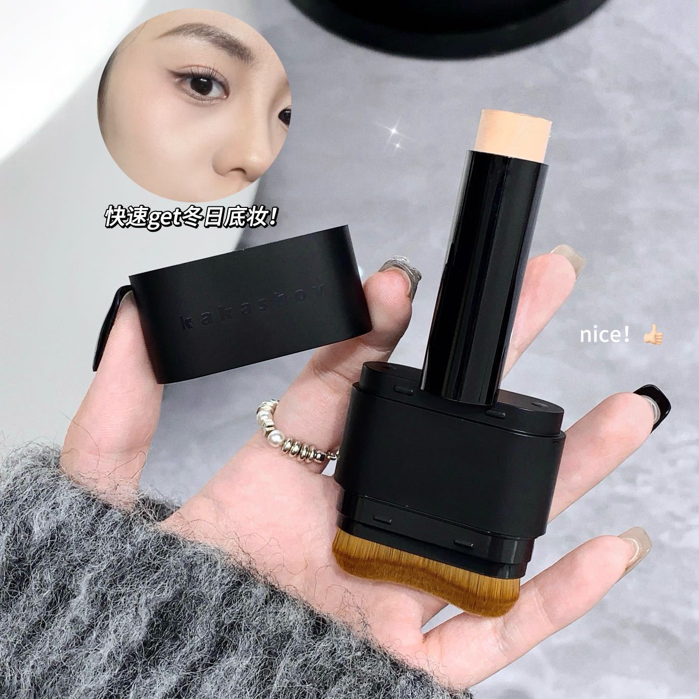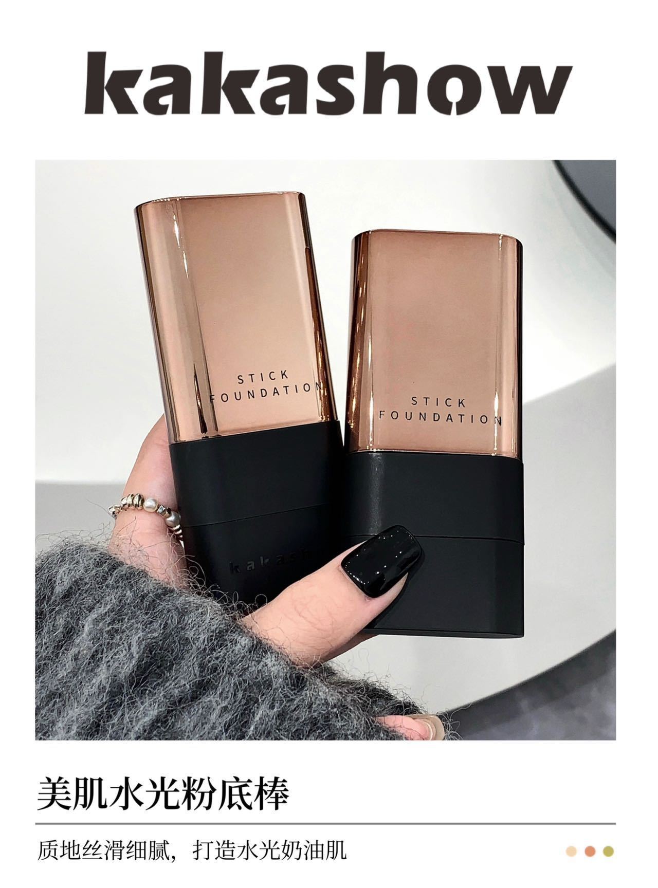 - Kakashow Water Glow Foundation Stick with an attached brush for application