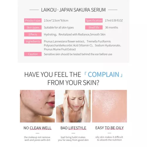 - 1.Sakura serum contains sakura extract, which is known for its moisturizing, anti-aging, brightening and anti-inflammatory functions.2. Intensely rehydrate, restore skin’s glow and smoothen skin3.For Dull Skin, it can brighten the skin tone4.Suitable for all skin types and sensitive skin5.Sakura extract is with excellent moisturizing and whitening effect and more than 80% of the ingredients are natural, which is safe for skin6.Repairing the dry lines due to lacking of moisture.7.Restoring the skin elasticity, leaving skin smooth