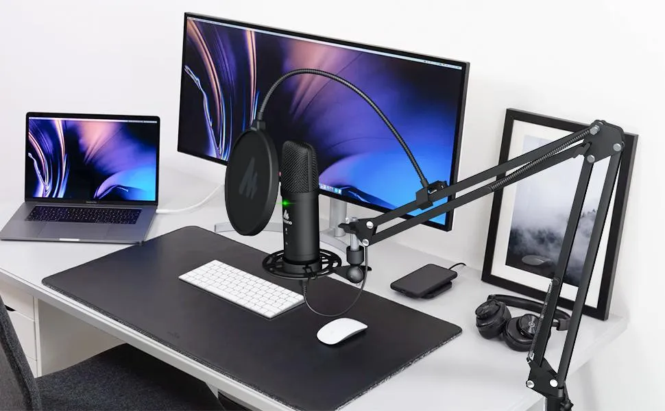 clip on any desktop with a thickness of 2". Pop filter and foam