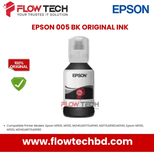 The Epson 005 Black Ink Bottle is the ideal replacement ink for Epson inkjet printers, offering exceptional value with its high page yield. This ink bottle is designed to ensure cost-effective, high-volume printing over an extended period, making it perfect for both personal and professional use. The Epson 005 is compatible with a range of Epson EcoTank Monochrome Ink Tank Printers, including the M1100, M1120, M1140, M2140, and M3170 models.