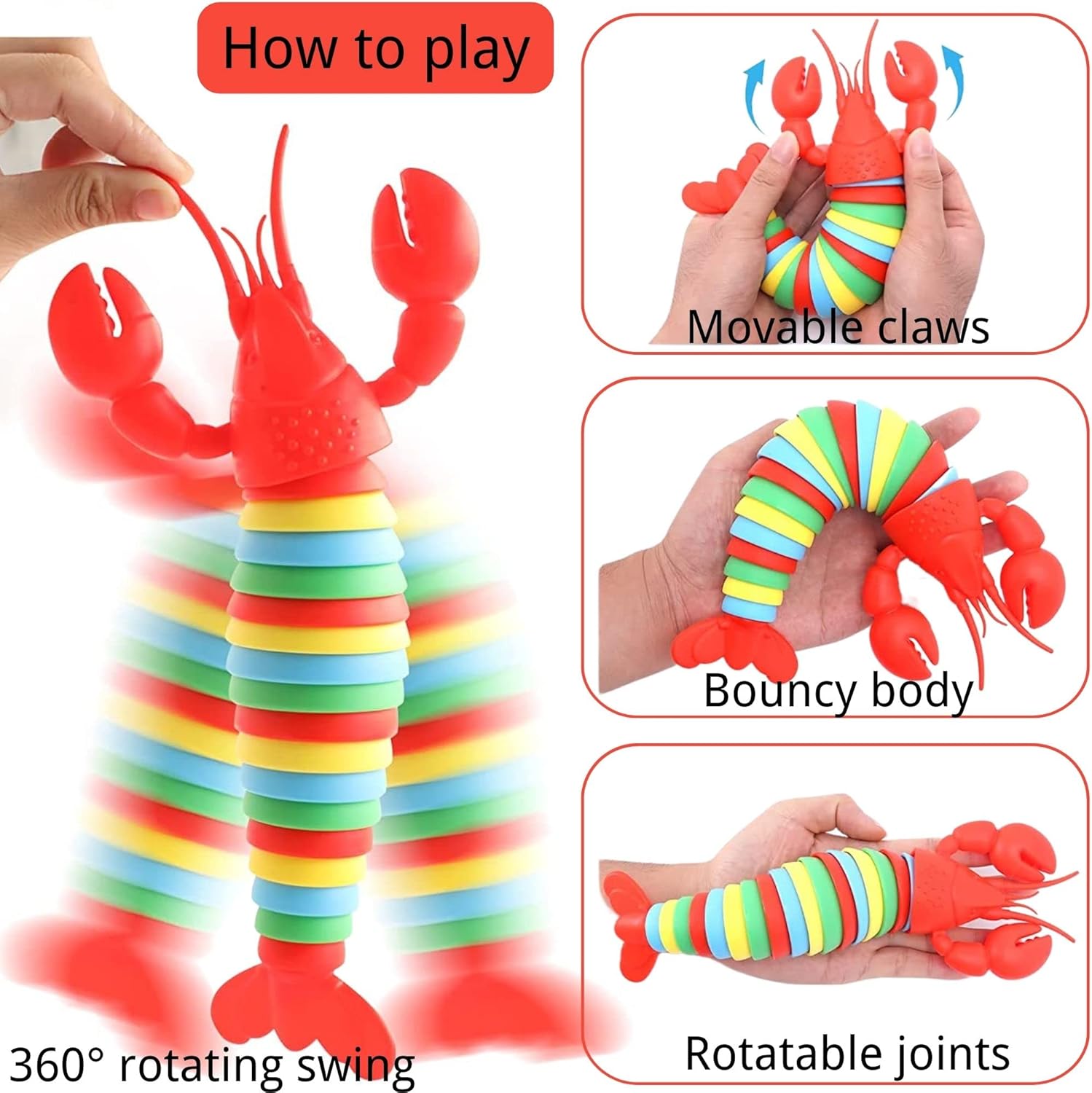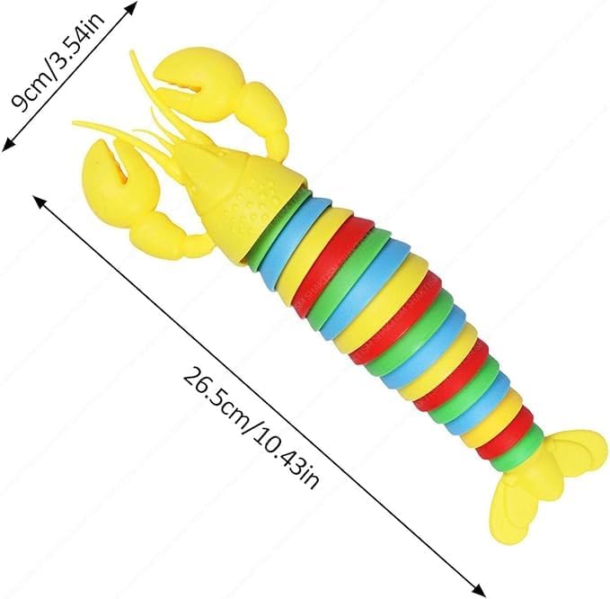 Fidget lobster Toy】The fidget lobster toy is about 10.6 x 2 inches, weight is 90.5g. The Lobster toy can rotate 360 degrees, has a total of 18 joints, and is super flexible. Extremely realistic, cute appearance and bright colors.You can twist the Slug body at will,while swinging the fidget slug toy on your hand,it will make a crisp sound,Touch and hearing give anxiety a very comfortable decompression feeling.