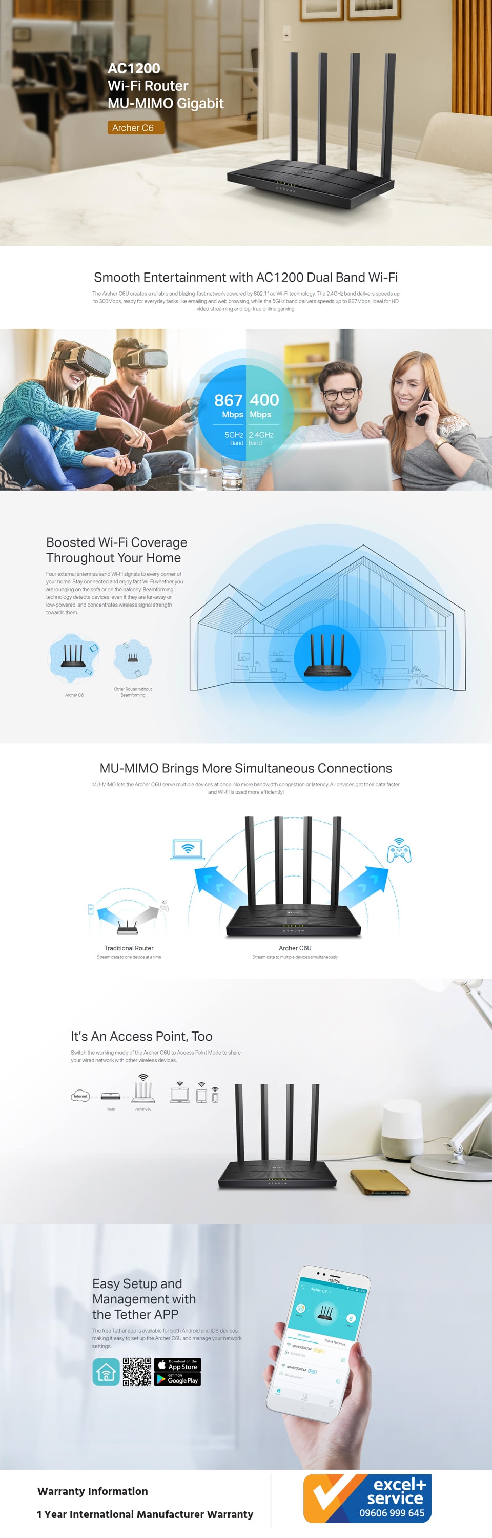 - Simultaneous 2.4GHz 300 Mbps and 5GHz 867 Mbps connections for 1200 Mbps of total available bandwidth