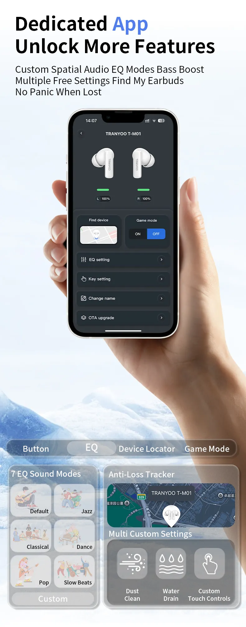 earbuds locator and mode switching. Enjoy up to