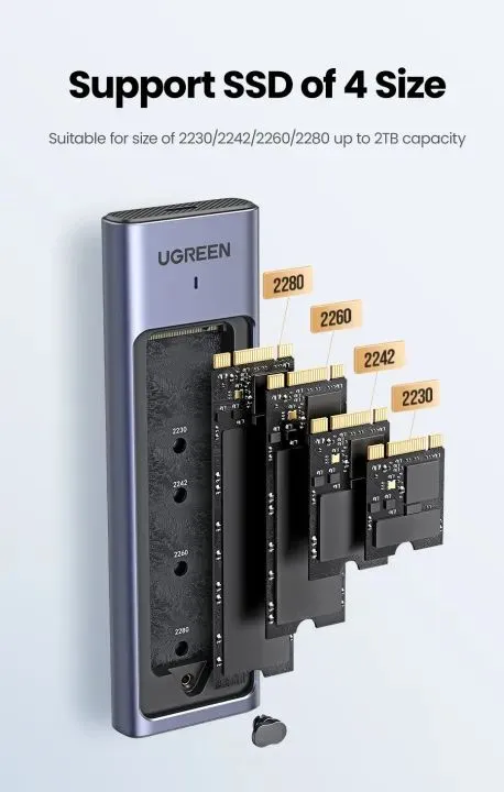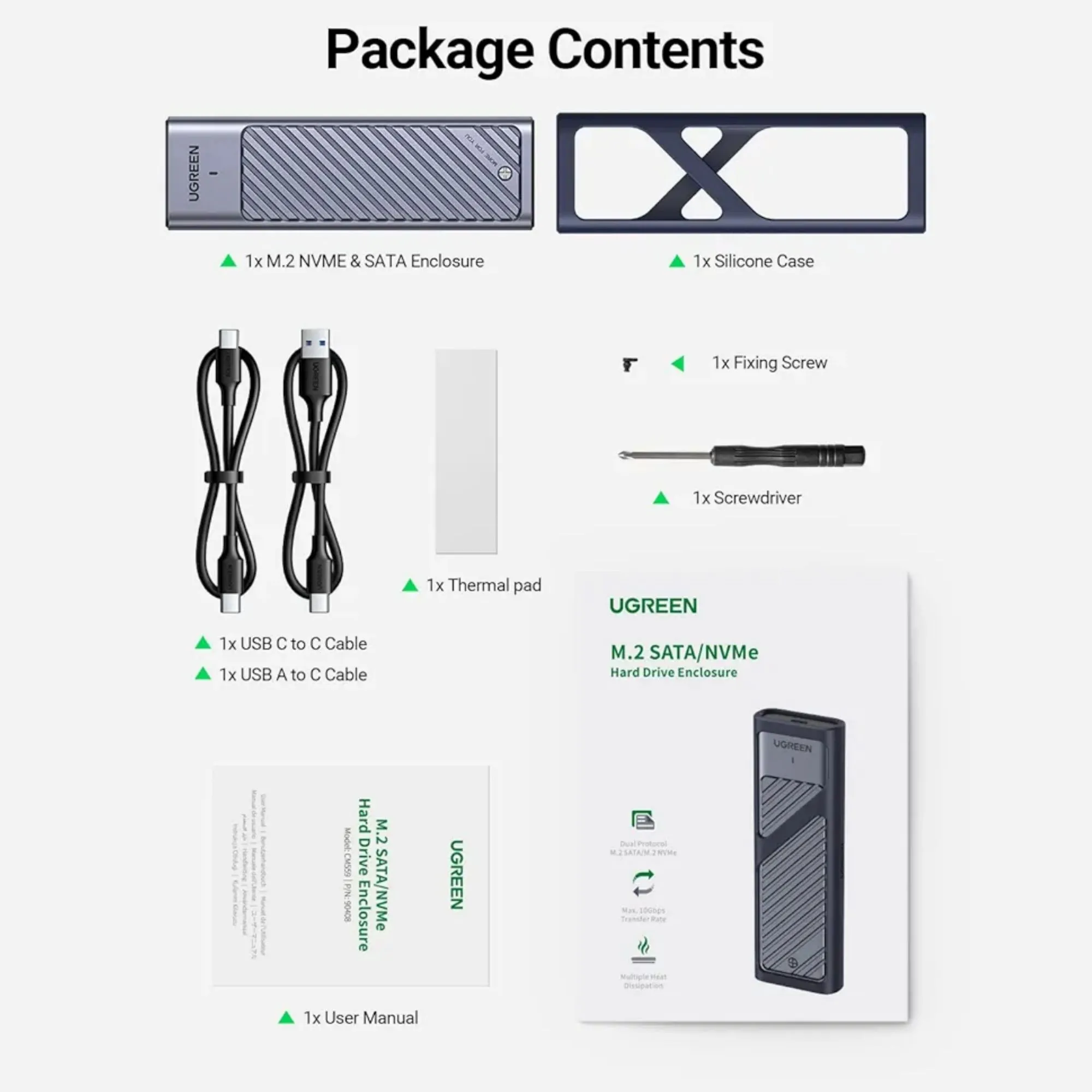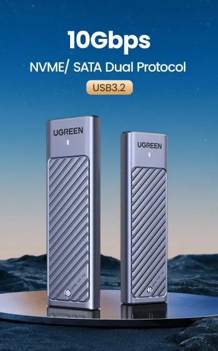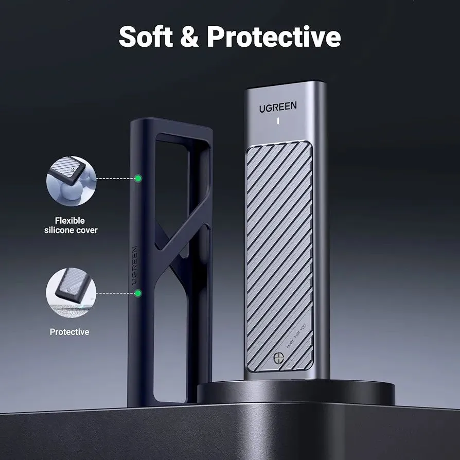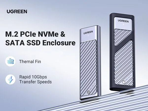 - ?Convert your internal M.2 SSD (Solid State Drive) into a blazing-fast external portable drive with the UGREEN CM559 Dual Protocol Enclosure. Perfect for professionals, gamers, and content creators, this sleek aluminum case ensures lightning-fast data transfers and superior durability, turning your old or new SSD into reliable external storage.