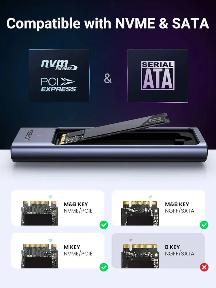 - ?Dual Protocol Compatibility (NVMe & SATA): Why choose one when you can have both? The CM559 supports both M.2 NVMe (M-Key, B+M Key) and M.2 SATA (B+M Key) SSDs, making it universally compatible with almost any M.2 drive on the market (sizes 2230, 2242, 2260, 2280).