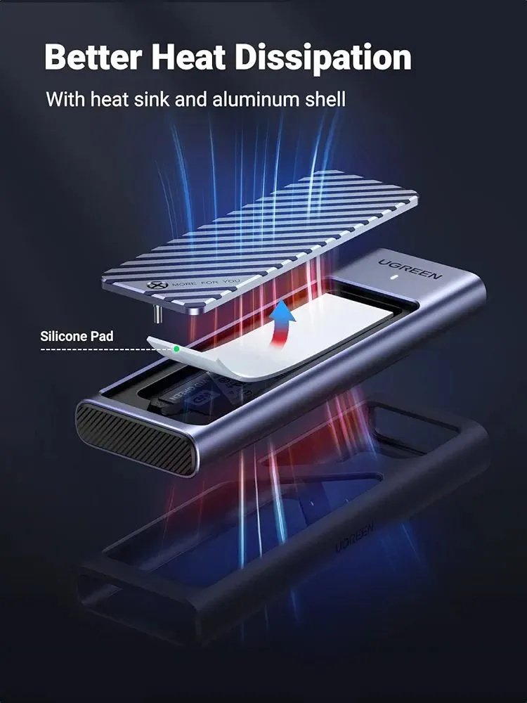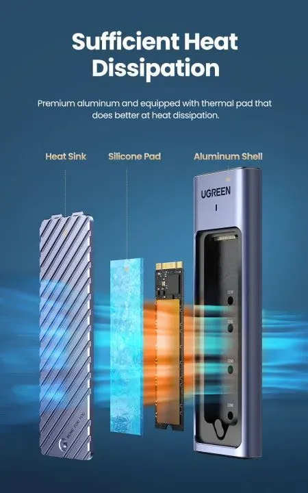- * Excellent Heat Dissipation: Constructed from premium Aluminum Alloy, the enclosure acts as a natural heatsink, keeping your SSD cool during heavy load operations. This protective design ensures stable, consistent high speeds and prevents data loss due to overheating.