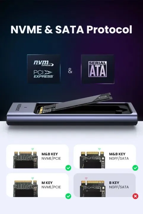 - * Dual Protocol Compatibility (NVMe & SATA): Why choose one when you can have both? The CM559 supports both M.2 NVMe (M-Key, B+M Key) and M.2 SATA (B+M Key) SSDs, making it universally compatible with almost any M.2 drive on the market (sizes 2230, 2242, 2260, 2280).