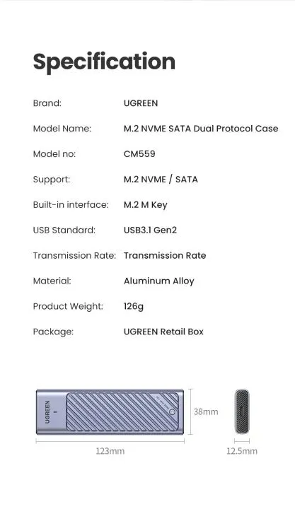 - UGREEN CM559 M.2 NVMe SATA SSD Enclosure: Portable 10Gbps Storage Solution
