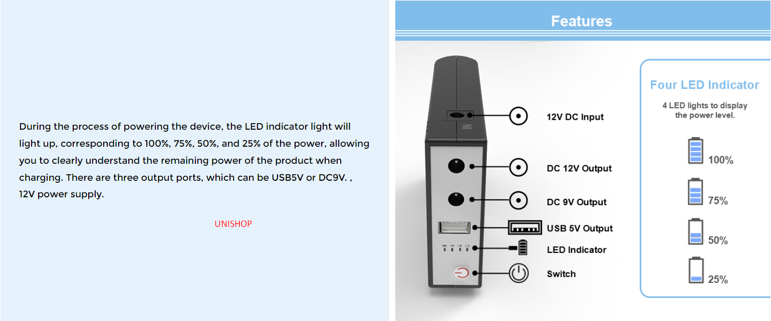 | UPS IN jack | 5.5*2.1mm, OUT:5V USB |