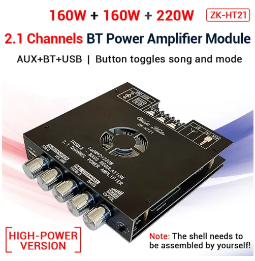 • Product name: 2.1 channel Bluetooth audio power amplifier moduleProduct model: ZK-HT21for Bluetooth version: 5.0 (unobstructed, 15 meters)Input method: AUX + for Bluetooth + USB (the dial button to switch modes and songs)Number of channels: 2.1 channels (left channel + right channel + subwoofer)Amplifier chip: TDA7498EAdapter power supply: DC15~36 V (under voltage protection below 9V, 12V power supply can also be supported)Adapted speakers: 30-200W, 4-8ΩOutput power: left and right channels ≤160w, Subwoofer≤220wProtection mechanism: anti-reverse connection, undervoltage, overheating, overcurrent, short circuit protectionProduct size: 145*126*28mmProduct weight: net weight 327g, including packaging 395gTip: When the audio signal input is large enough and the power supply voltage/current is large enough, there will be enough output Power!The higher the power supply voltage, the greater the output power, and the smaller the speaker impedance, the greater the output power! Please make sure that the power of the adaptor is greater than the actual working power of the amplifier!