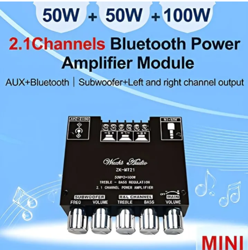 - ZK-MT21 Bluetooth 5.0 Subwoofer Amplifier Board.• 50WX2+100W 2.1 Channel Power Audio Stereo Amplifier.• Enhanced bass with Tone Board Bass AMP AUX.• Ideal for home entertainment receivers and amplifiers.Step 4:- No false information found.Step 5:- Return the product highlights to the user.